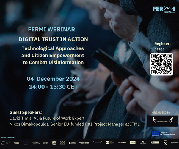 As part the FERMI initiative, we’re excited to announce our upcoming webinar, Digital Trust in Action: Technological Approaches and Citizen Empowerment to Combat Disinformation, organised by CONVERGENCE and scheduled for December 4, 2024, from 14:00 to 15:30 CET.